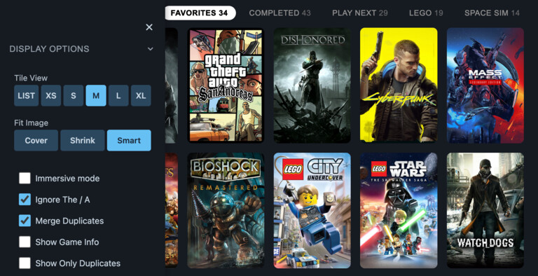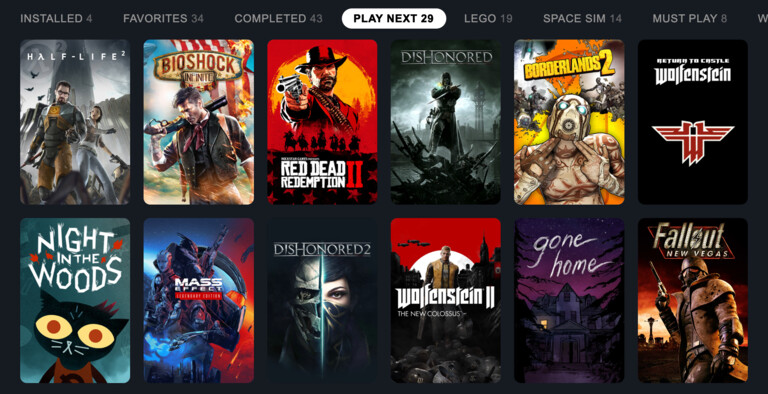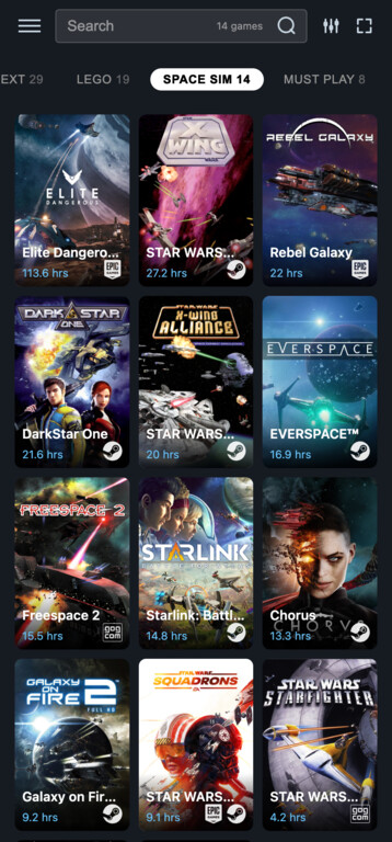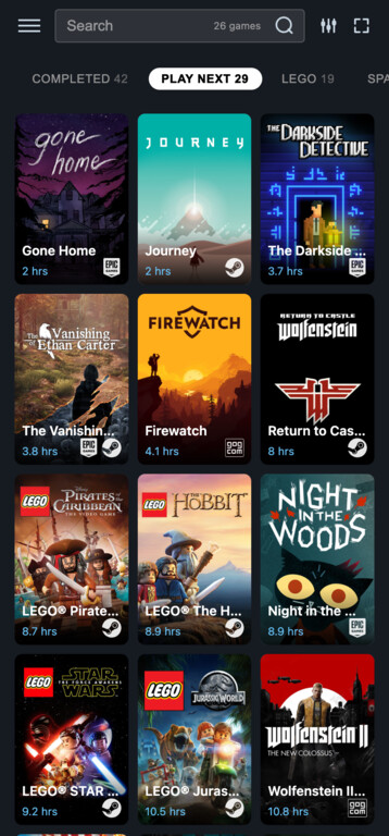 Browse by review scores, HowLongToBeat playtime estimates or installation size. Shuffle your library for surprise picks.